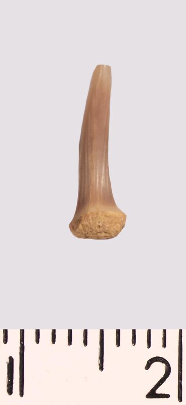 Зуб (фрагмент). Акула. Scapanorhynchus raphiodon (Agassiz, 1843). Классификация: Хордовые Chordata, Позвоночные Vertebrata, Хрящевые рыбы Chondrichthyes, Пластиножаберные Elasmobranchii, Акулы Selachii, Ламнообразные Lamniformes