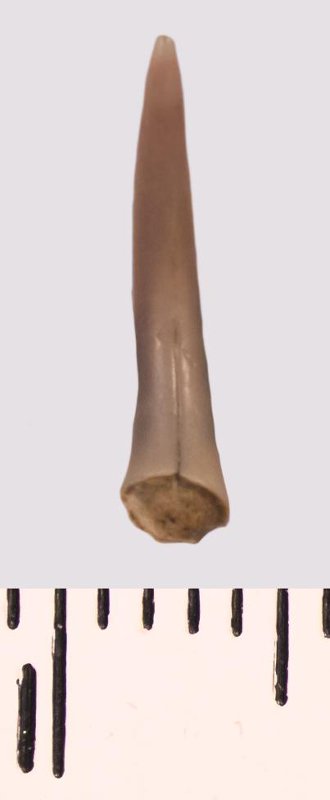 Зуб (фрагмент). Акула. Scapanorhynchus raphiodon (Agassiz, 1843). Классификация: Хордовые Chordata, Позвоночные Vertebrata, Хрящевые рыбы Chondrichthyes, Пластиножаберные Elasmobranchii, Акулы Selachii, Ламнообразные Lamniformes