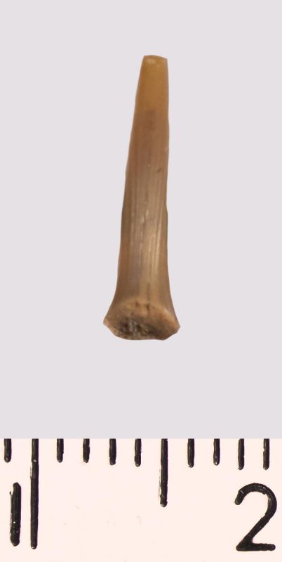 Зуб (фрагмент). Акула. Scapanorhynchus raphiodon (Agassiz, 1843). Классификация: Хордовые Chordata, Позвоночные Vertebrata, Хрящевые рыбы Chondrichthyes, Пластиножаберные Elasmobranchii, Акулы Selachii, Ламнообразные Lamniformes