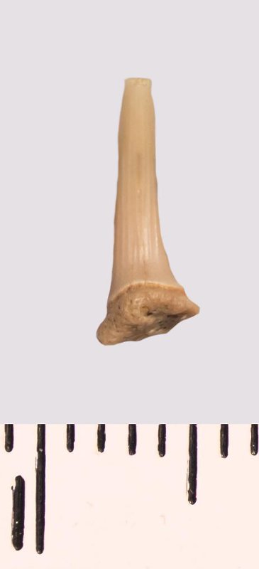 Зуб (фрагмент). Акула. Scapanorhynchus raphiodon (Agassiz, 1843). Классификация: Хордовые Chordata, Позвоночные Vertebrata, Хрящевые рыбы Chondrichthyes, Пластиножаберные Elasmobranchii, Акулы Selachii, Ламнообразные Lamniformes