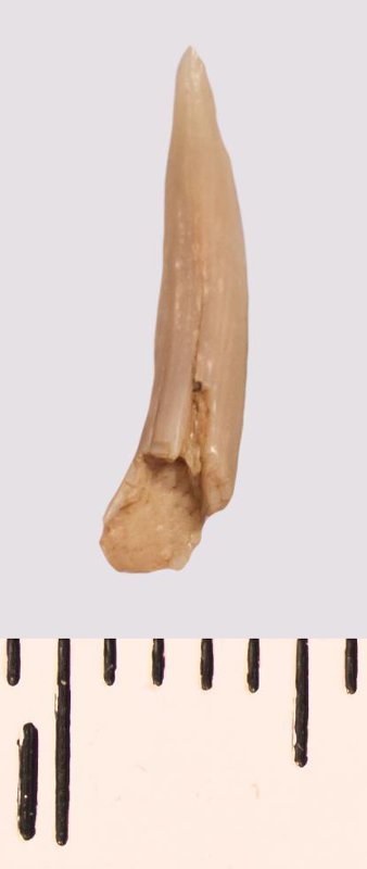 Зуб (фрагмент). Акула. Scapanorhynchus raphiodon (Agassiz, 1843). Классификация: Хордовые Chordata, Позвоночные Vertebrata, Хрящевые рыбы Chondrichthyes, Пластиножаберные Elasmobranchii, Акулы Selachii, Ламнообразные Lamniformes