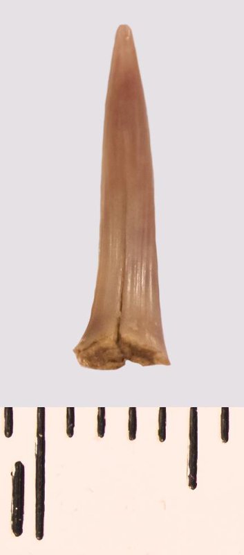 Зуб (фрагмент). Акула. Scapanorhynchus raphiodon (Agassiz, 1843). Классификация: Хордовые Chordata, Позвоночные Vertebrata, Хрящевые рыбы Chondrichthyes, Пластиножаберные Elasmobranchii, Акулы Selachii, Ламнообразные Lamniformes