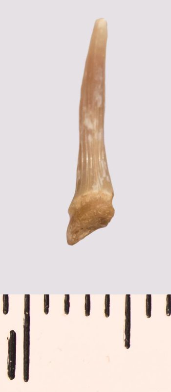 Зуб (фрагмент). Акула. Scapanorhynchus raphiodon (Agassiz, 1843). Классификация: Хордовые Chordata, Позвоночные Vertebrata, Хрящевые рыбы Chondrichthyes, Пластиножаберные Elasmobranchii, Акулы Selachii, Ламнообразные Lamniformes