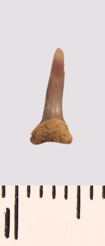 Зуб (фрагмент). Акула. Scapanorhynchus raphiodon (Agassiz, 1843). Классификация: Хордовые Chordata, Позвоночные Vertebrata, Хрящевые рыбы Chondrichthyes, Пластиножаберные Elasmobranchii, Акулы Selachii, Ламнообразные Lamniformes