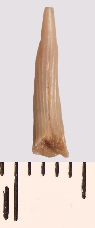 Зуб (фрагмент). Акула. Scapanorhynchus raphiodon (Agassiz, 1843). Классификация: Хордовые Chordata, Позвоночные Vertebrata, Хрящевые рыбы Chondrichthyes, Пластиножаберные Elasmobranchii, Акулы Selachii, Ламнообразные Lamniformes