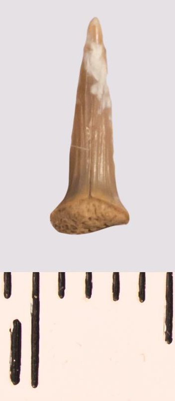 Зуб (фрагмент). Акула. Scapanorhynchus raphiodon (Agassiz, 1843). Классификация: Хордовые Chordata, Позвоночные Vertebrata, Хрящевые рыбы Chondrichthyes, Пластиножаберные Elasmobranchii, Акулы Selachii, Ламнообразные Lamniformes