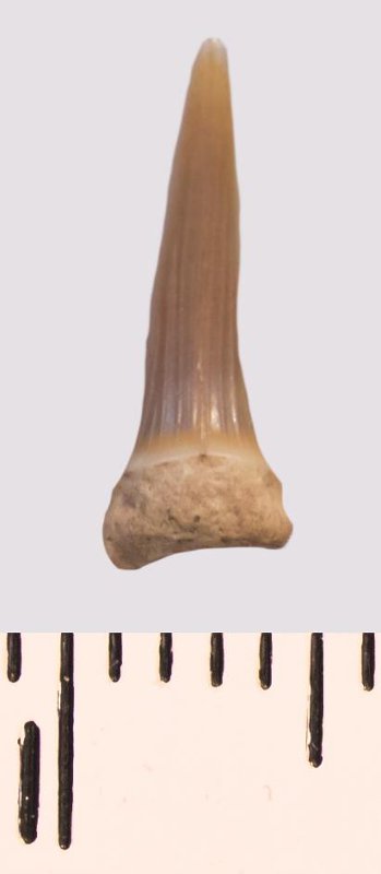 Зуб (фрагмент). Акула. Scapanorhynchus raphiodon (Agassiz, 1843). Классификация: Хордовые Chordata, Позвоночные Vertebrata, Хрящевые рыбы Chondrichthyes, Пластиножаберные Elasmobranchii, Акулы Selachii, Ламнообразные Lamniformes