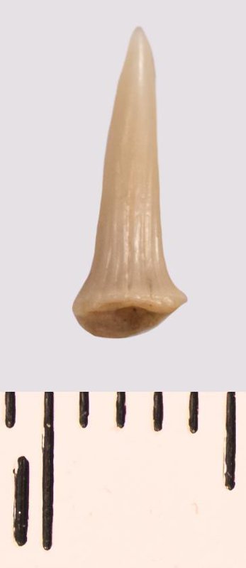 Зуб (фрагмент). Акула. Scapanorhynchus raphiodon (Agassiz, 1843). Классификация: Хордовые Chordata, Позвоночные Vertebrata, Хрящевые рыбы Chondrichthyes, Пластиножаберные Elasmobranchii, Акулы Selachii, Ламнообразные Lamniformes