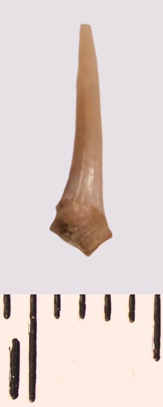 Зуб (фрагмент). Акула. Scapanorhynchus raphiodon (Agassiz, 1843). Классификация: Хордовые Chordata, Позвоночные Vertebrata, Хрящевые рыбы Chondrichthyes, Пластиножаберные Elasmobranchii, Акулы Selachii, Ламнообразные Lamniformes
