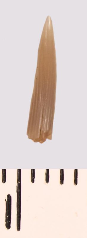 Зуб (фрагмент). Акула. Scapanorhynchus raphiodon (Agassiz, 1843). Классификация: Хордовые Chordata, Позвоночные Vertebrata, Хрящевые рыбы Chondrichthyes, Пластиножаберные Elasmobranchii, Акулы Selachii, Ламнообразные Lamniformes