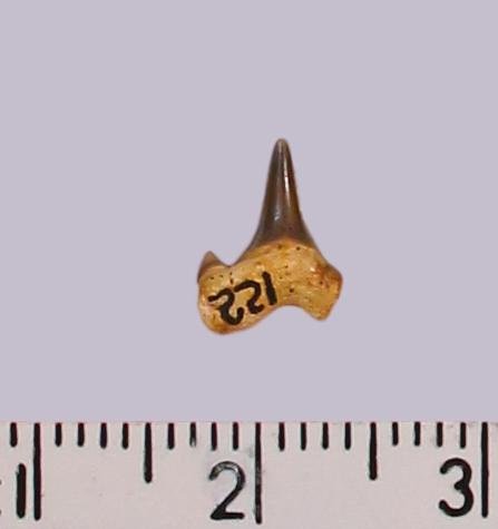 Средних размеров задний? зуб с коронкой бурого цвета, режущего типа, без скульптуры, с гладким режущим краем. Корень охристый, арочный, умеренно массивный, симметричный, со следами окатанности; утрачена правая ветвь. С лингвальной стороны корня питательное отверстие. Имелась одна пара добавочных зубцов коронки, сохранился только левый.