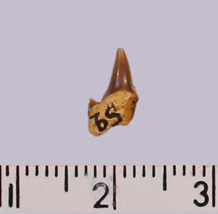 Средних размеров задний зуб с коронкой бурого цвета, режущего типа, без скульптуры, с гладким режущим краем. Корень охристый, арочный, умеренно массивный, со следами сильной окатанности; утрачена правая ветвь. Имелась одна пара добавочных зубцов коронки, сохранился только левый.