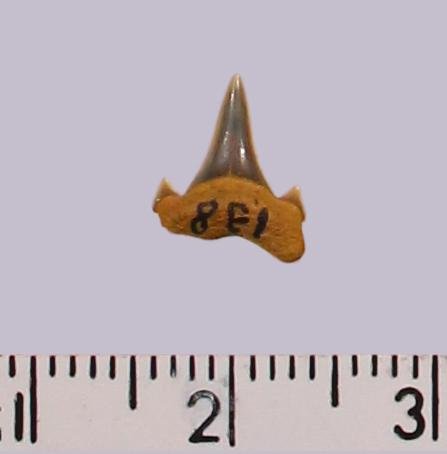Средних размеров задне-боковой зуб с коронкой темно-серого цвета, режущего типа, без скульптуры, с гладким режущим краем. Корень охристый, арочный, умеренно массивный, со следами сильной окатанности; утрачена левая ветвь. Имеется одна пара добавочных зубцов коронки.