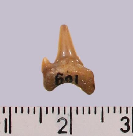 Средних размеров боковой зуб с коронкой кремового цвета, режущего типа, без скульптуры, с гладким режущим краем. Корень грязно-кремового цвета, арочный, умеренно массивный, асимметричный, со следами окатанности; правая ветвь немного длиннее левой. С лингвальной стороны корня питательное отверстие. Имелась одна пара добавочных зубцов коронки, сохранился только левый.