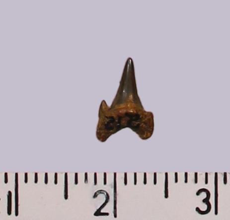 Мелкий задне-боковой зуб с коронкой черного цвета, режущего типа, без скульптуры, с гладким режущим краем. Корень буро-охристый, арочный, умеренно массивный, симметричный, со следами сильной окатанности и эрозии. С лингвальной стороны корня питательное отверстие. Имелась одна пара добавочных зубцов коронки, сохранился только левый.