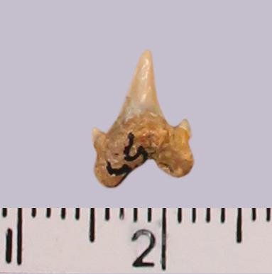 Средних размеров задний зуб с коронкой светло-кремового цвета с белесыми вкраплениями, режущего типа, без скульптуры, с гладким режущим краем. Корень желтовато-серый, арочный, умеренно массивный, симметричный, со следами окатанности и эрозии. С лингвальной стороны корня питательное отверстие. Имеется одна пара добавочных зубцов коронки.