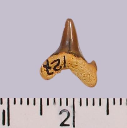 Средних размеров задне-боковой зуб с коронкой темно-бежевого цвета, режущего типа, без скульптуры, с гладким режущим краем. Корень светло-охристый, арочный, умеренно массивный, симметричный, со следами окатанности и эрозии. Имелась одна пара добавочных зубцов коронки, сохранился только правый.