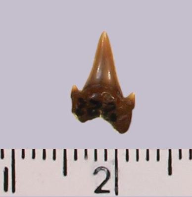 Средних размеров задне-боковой? зуб с коронкой бежевого цвета, режущего типа, без скульптуры, с гладким режущим краем. Корень бурый, арочный, умеренно массивный, со следами сильной окатанности. Имеется одна пара добавочных зубцов коронки.