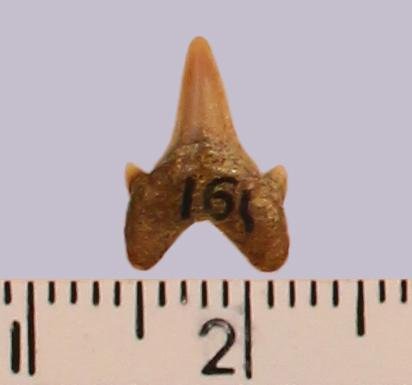 Средних размеров задне-боковой зуб с коронкой темно-кремового цвета, режущего типа, без скульптуры, с гладким режущим краем. Корень темно-коричневый, арочный, умеренно массивный, симметричный. С лингвальной стороны корня питательное отверстие. Имеется одна пара добавочных зубцов коронки.