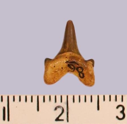 Средних размеров задне-боковой зуб с коронкой бурого цвета, режущего типа, без скульптуры, с гладким режущим краем. Корень грязновато-охристый, арочный, умеренно массивный, симметричный, со следами окатанности. С лингвальной стороны корня питательное отверстие. Имеется одна пара добавочных зубцов коронки.