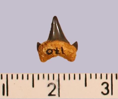 Средних размеров задний? зуб с коронкой черного цвета, режущего типа, без скульптуры, с гладким режущим краем. Корень охристый, арочный, умеренно массивный, симметричный, со следами сильной окатанности. Имеется одна пара добавочных зубцов коронки.