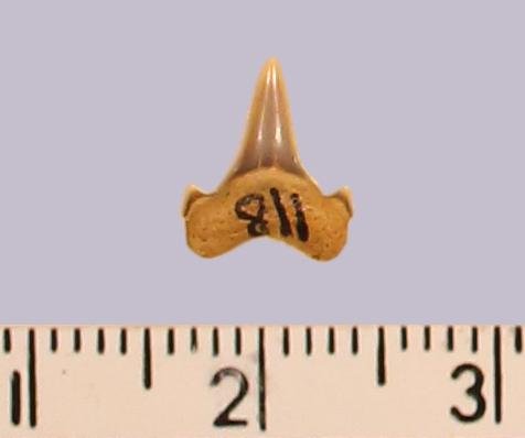 Средних размеров задний? зуб с коронкой темно-серого цвета, режущего типа, без скульптуры, с гладким режущим краем. Корень светлый, серовато-охристый, арочный, умеренно массивный, симметричный, со следами сильной окатанности. Имеется одна пара добавочных зубцов коронки.