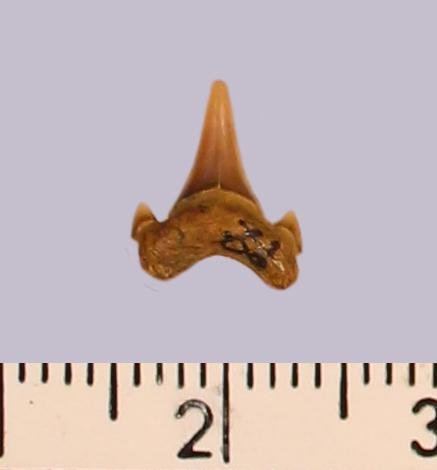 Мелкий боковой зуб с коронкой темного, охристо-бежевого цвета, режущего типа, без скульптуры, с гладким режущим краем. Корень темно-охристый, арочный, умеренно массивный, симметричный, со следами окатанности. Имеется одна пара добавочных зубцов коронки.