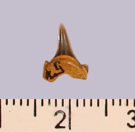 Мелкий боковой зуб с коронкой темно-серого цвета, режущего типа, без скульптуры, с гладким режущим краем. Корень темно-охристый, арочный, умеренно массивный, симметричный, со следами сильной окатанности. С лингвальной стороны корня питательное отверстие. Имеется одна пара добавочных зубцов коронки.