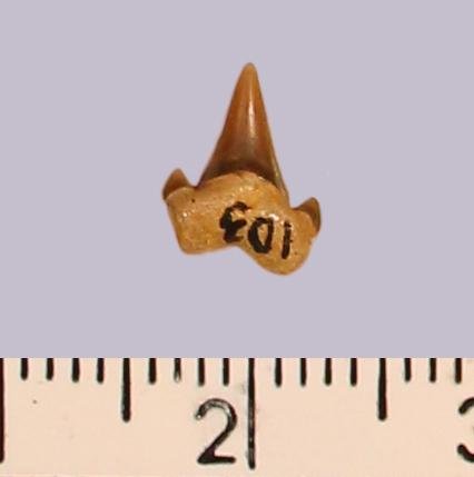 Мелкий задне-боковой зуб с коронкой бурого цвета, режущего типа, без скульптуры, с гладким режущим краем. Корень серо-охристый, арочный, умеренно массивный, асимметричный, со следами сильной окатанности; правая ветвь длиннее левой. Имеется одна пара добавочных зубцов коронки.