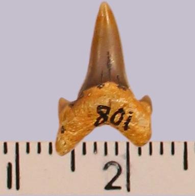 Средних размеров боковой зуб с коронкой темно-бежевого цвета, режущего типа, без скульптуры, с гладким режущим краем. Корень охристый, арочный, умеренно массивный, асимметричный, со следами окатанности; левая ветвь длиннее правой. С лингвальной стороны корня питательное отверстие. Имеется одна пара добавочных зубцов коронки.