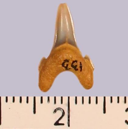 Мелкий боковой зуб с коронкой серого цвета, режущего типа, без скульптуры, с гладким режущим краем. Корень охристый, арочный, умеренно массивный, симметричный, со следами сильной окатанности. С лингвальной стороны корня питательное отверстие. Имеется одна пара добавочных зубцов коронки.