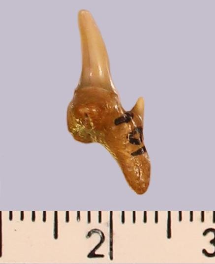 Средних размеров зуб с коронкой светлого, серовато-кремового цвета, рвуще-режущего типа, сильно S-образно изогнутой и сжатой латерально, без скульптуры, с гладким режущим краем. Корень темный, грязно-охристый, арочный, высокий, умеренно массивный, сильно сжатый латерально, с очень развитым протуберанцем и следами окатанности; утрачена левая ветвь. Лабиальная часть корня заметно вогнута. С лингвальной стороны корня питательное отверстие. Имелась одна пара добавочных зубцов коронки, сохранился только правый.