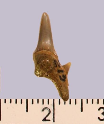 Зуб. Акула. Protolamna cf. sokolovi Cappetta, 1980. Классификация: Хордовые Chordata, Позвоночные Vertebrata, Хрящевые рыбы Chondrichthyes, Пластиножаберные Elasmobranchii, Акулы Selachii, Ламнообразные Lamniformes, Pseudoscapanorhynchidae