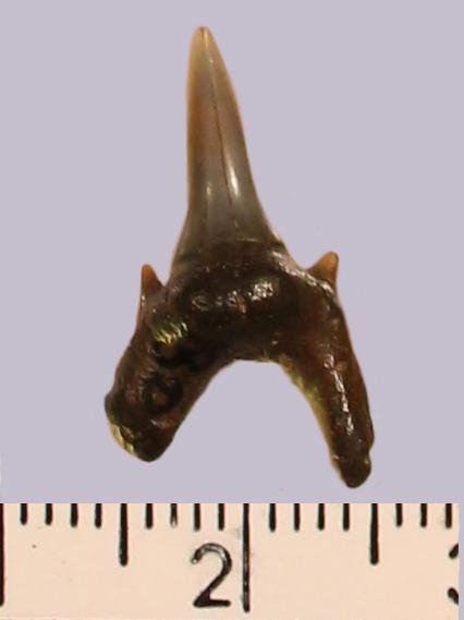 Средних размеров зуб с коронкой темно-серого цвета, рвуще-режущего типа, сильно S-образно изогнутой, без скульптуры, с гладким режущим краем. Корень черный, арочный, высокий, умеренно массивный, асимметричный, с очень развитым протуберанцем и следами окатанности; правая ветвь длиннее и уже левой. Лабиальная часть корня заметно вогнута. С лингвальной стороны корня питательное отверстие?. Имеется одна пара добавочных зубцов коронки.