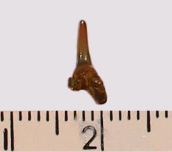 Мелкий боковой зуб с коронкой темно-охристого цвета, колюще-режущего типа, с гладким режущим краем. Корень буро-охристый, арочный, умеренно массивный, со следами сильной окатанности и эрозии; утрачена левая ветвь. Добавочные зубцы коронки отсутствуют.