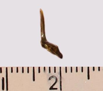 Правая половина мелкого бокового зуба с коронкой серо-бурого цвета, с гладким режущим краем. С лингвальной стороны у основания коронки на эмали имеется скульптура в виде слабой продольной струйчатости. Корень черный, арочный, умеренно массивный, со следами сильной окатанности и сколами; утрачена левая ветвь. Добавочные зубцы коронки отсутствуют.