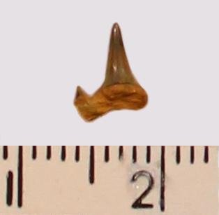 Мелкий боковой зуб с коронкой темного, серо-охристого цвета, режущего типа, с гладким режущим краем. С лингвальной стороны у основания коронки на эмали имеется скульптура в виде слабой продольной струйчатости. Корень охристый, арочный, умеренно массивный, со следами сильной окатанности и сколами; правая ветвь утрачена. Имелась одна пара добавочных зубцов коронки, сохранился только левый.