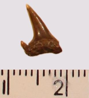 Мелкий боковой зуб с коронкой бурого цвета, режущего типа, с гладким режущим краем. Корень бурый, арочный, умеренно массивный, со следами сильной окатанности и сколами; фрагмент правой ветви утрачен. Имелась одна пара добавочных зубцов коронки, сохранился только левый.