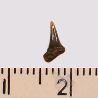 Мелкий боковой зуб с коронкой темно-серого цвета, режущего типа, с гладким режущим краем. Корень черно-бурый, арочный, умеренно массивный, со следами сильной окатанности и сколами; правая ветвь утрачена. Добавочные зубцы коронки отсутствуют.