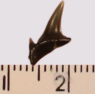 Мелкий боковой зуб с коронкой черного цвета, режущего типа, с гладким режущим краем. Корень черный, арочный, умеренно массивный; правая ветвь утрачена. С лингвальной стороны корня питательная борозда. Имелась одна пара добавочных зубцов коронки, сохранился только левый.