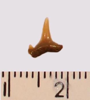 Мелкий боковой зуб с коронкой светло-охристого цвета, режущего типа, с гладким режущим краем. Корень темно-охристый, арочный, умеренно массивный, со следами сильной окатанности. С лингвальной стороны корня питательная борозда. Имелась одна пара добавочных зубцов коронки, сохранился только левый.