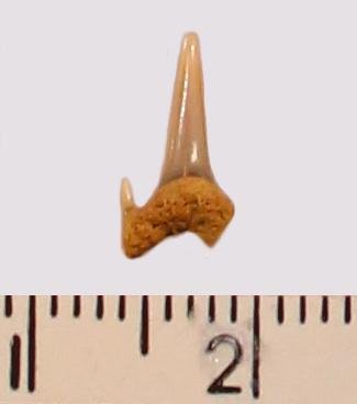 Мелкий боковой зуб с коронкой светло-серого цвета, колюще-режущего типа, с гладким режущим краем. Корень охристый, арочный, умеренно массивный; фрагмент правой ветви утрачен. С лингвальной стороны корня питательная борозда. Имелась одна пара добавочных зубцов коронки, сохранился только левый.