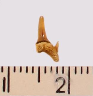 Мелкий боковой зуб с коронкой охристо-бежевого цвета, колюще-режущего типа, с гладким режущим краем. С лингвальной стороны у основания коронки на эмали имеется скульптура в виде слабой продольной струйчатости. Корень светло-охристый, арочный, умеренно массивный; левая ветвь утрачена. С лингвальной стороны корня питательная борозда. Имелась одна пара добавочных зубцов коронки, сохранился только правый.