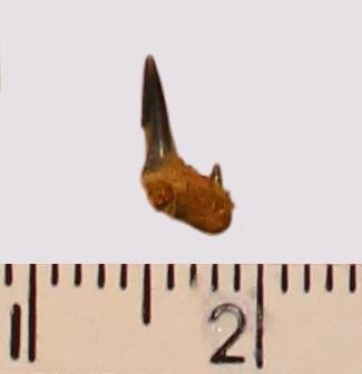 Мелкий боковой зуб с коронкой черного цвета, с гладким режущим краем. Корень охристый, арочный, умеренно массивный; левая ветвь утрачена. Имелась одна пара добавочных зубцов коронки, сохранился только правый.