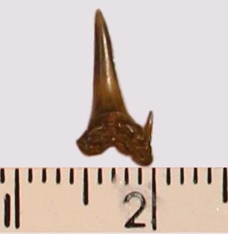 Мелкий зуб с коронкой бурого цвета, режущего типа, с гладким режущим краем. Корень бурый, арочный, умеренно массивный, со следами сильной окатанности; фрагмент левой ветви утрачен. С лингвальной стороны корня питательная борозда. Имелась одна пара добавочных зубцов коронки, сохранился только правый.