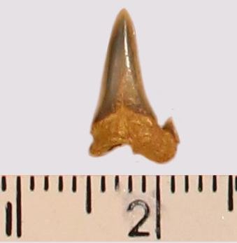 Мелкий боковой зуб с коронкой темно-серого цвета, режущего типа, с гладким режущим краем. Корень охристый, арочный, умеренно массивный, со следами сильной окатанности; левая ветвь утрачена. С лингвальной стороны корня питательная борозда. Имелась одна пара добавочных зубцов коронки, сохранился только правый.