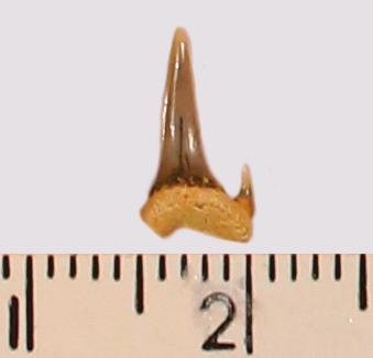 Мелкий боковой зуб с коронкой темно-серого цвета, режущего типа, с гладким режущим краем. С лингвальной стороны у основания коронки на эмали имеется скульптура в виде слабой продольной струйчатости. Корень светло-охристый, арочный, умеренно массивный, со следами сильной окатанности; левая ветвь утрачена. С лингвальной стороны корня питательная борозда. Имелась одна пара добавочных зубцов коронки, сохранился только правый.