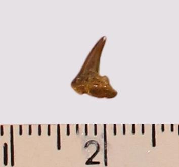 Мелкий боковой зуб с коронкой серо-бурого цвета, режущего типа, с гладким режущим краем. Корень серо-охристый, арочный, умеренно массивный, со следами сильной окатанности; утрачена левая ветвь. С лингвальной стороны корня питательная борозда. Добавочные зубцы коронки отсутствуют.