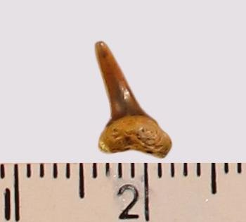 Мелкий боковой зуб с коронкой бурого цвета, режущего типа, с гладким режущим краем. С лингвальной стороны у основания коронки на эмали имеется скульптура в виде слабой продольной струйчатости. Корень охристый, арочный, умеренно массивный, со следами сильной окатанности; утрачена левая ветвь. Добавочные зубцы коронки отсутствуют.