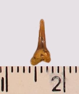 Мелкий боковой зуб с коронкой темного, охристо-бежевого цвета, колюще-режущего типа, с гладким режущим краем. С лингвальной стороны у основания коронки на эмали имеется скульптура в виде слабой продольной струйчатости. Корень охристый, арочный, умеренно массивный, со следами сильной окатанности; утрачена правая ветвь. Добавочные зубцы коронки отсутствуют.